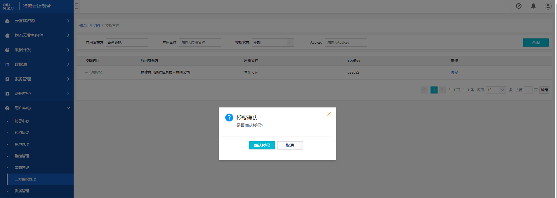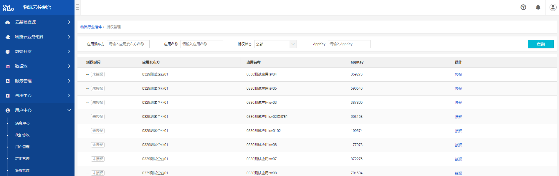 (1)使用注册的商家菜鸟账号登录到物流云平台对ISV进行授权。