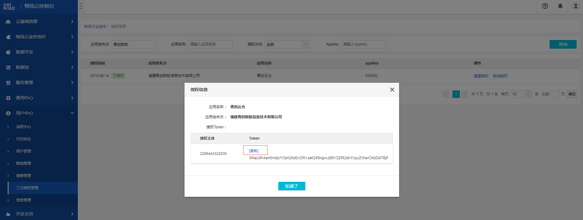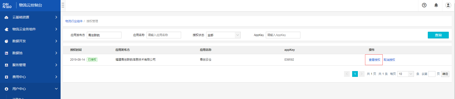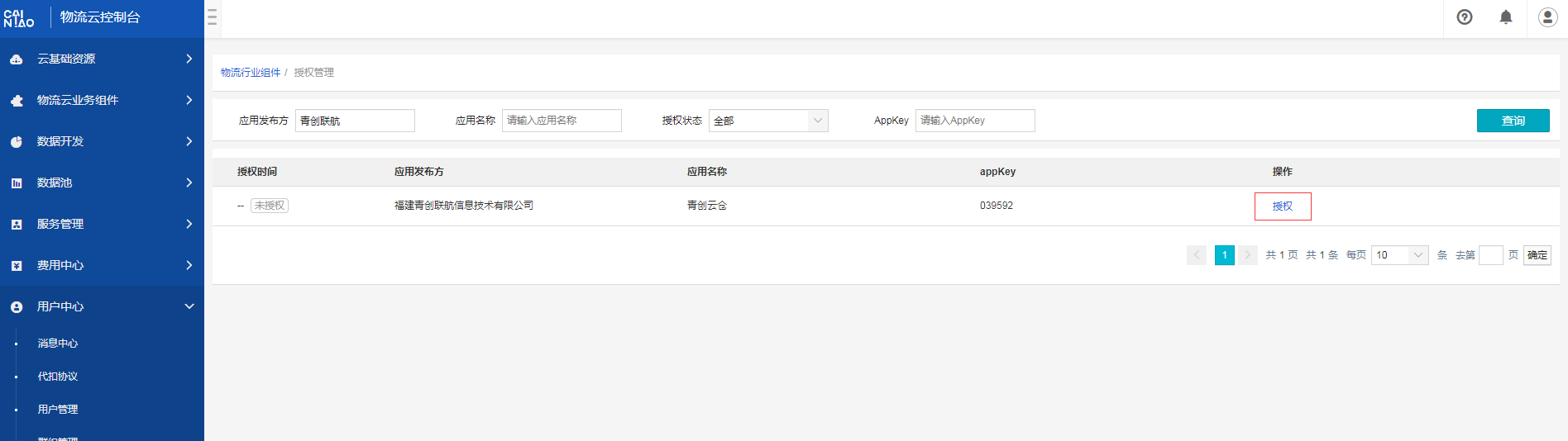 (2)使用应用发布方搜索到“青创联航”的进行授权