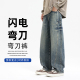 云仓闪发 美式复古水洗闪电纹弯刀牛仔裤男秋季设计感宽松直筒阔腿拖地裤子